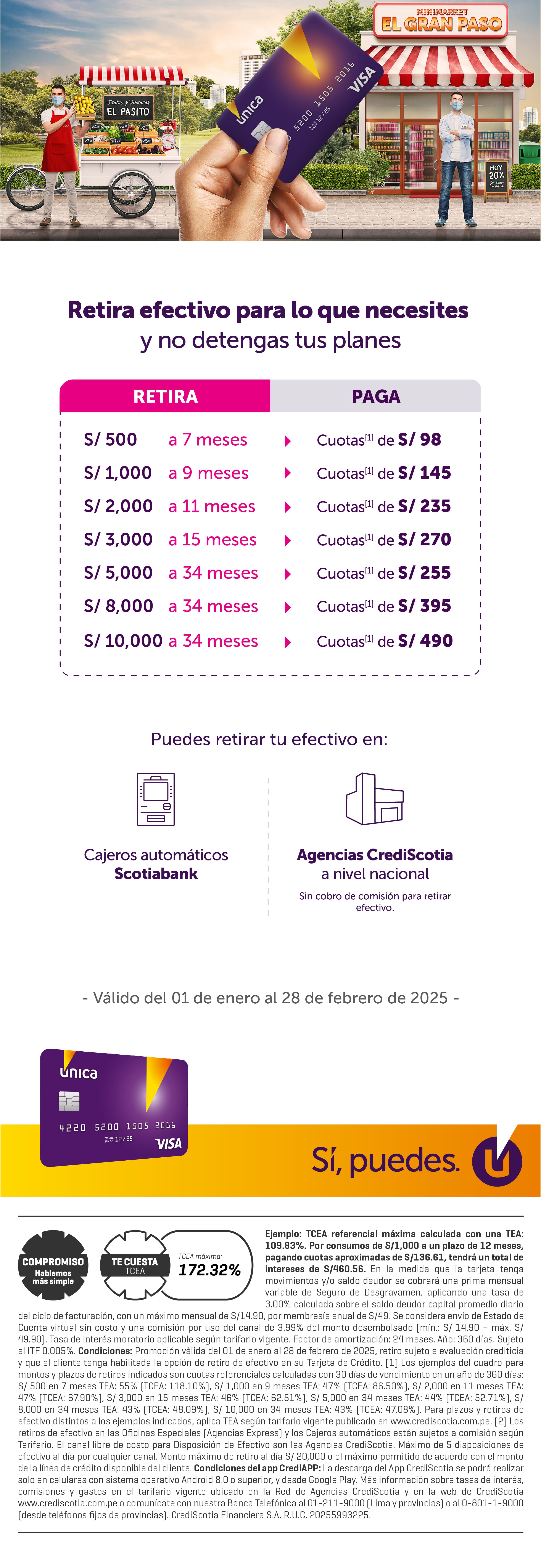 Tasa de interés moratorio aplicable según tarifario vigente. Factor de amortización: 24 meses. Año: 360 días. Sujeto al ITF 0.005%. Mayor información sobre tasas de interés, comisiones y gastos en el tarifario vigente ubicado en la red de Agencias Crediscotia y en www.crediscotia.com.pe o comunícate con nuestra Banca Telefónica al 01-211-9000 (Lima y provincias) o al 0-801-1-9000 (desde teléfonos fijos de provincias). CrediScotia Financiera S.A. R.U.C. 20255993225. (1) La línea de crédito de la tarjeta está disponible solo para clientes calificados previamente por CrediScotia y se otorgará sin nueva calificación en tanto el cliente mantenga las mismas condiciones crediticias evaluadas.